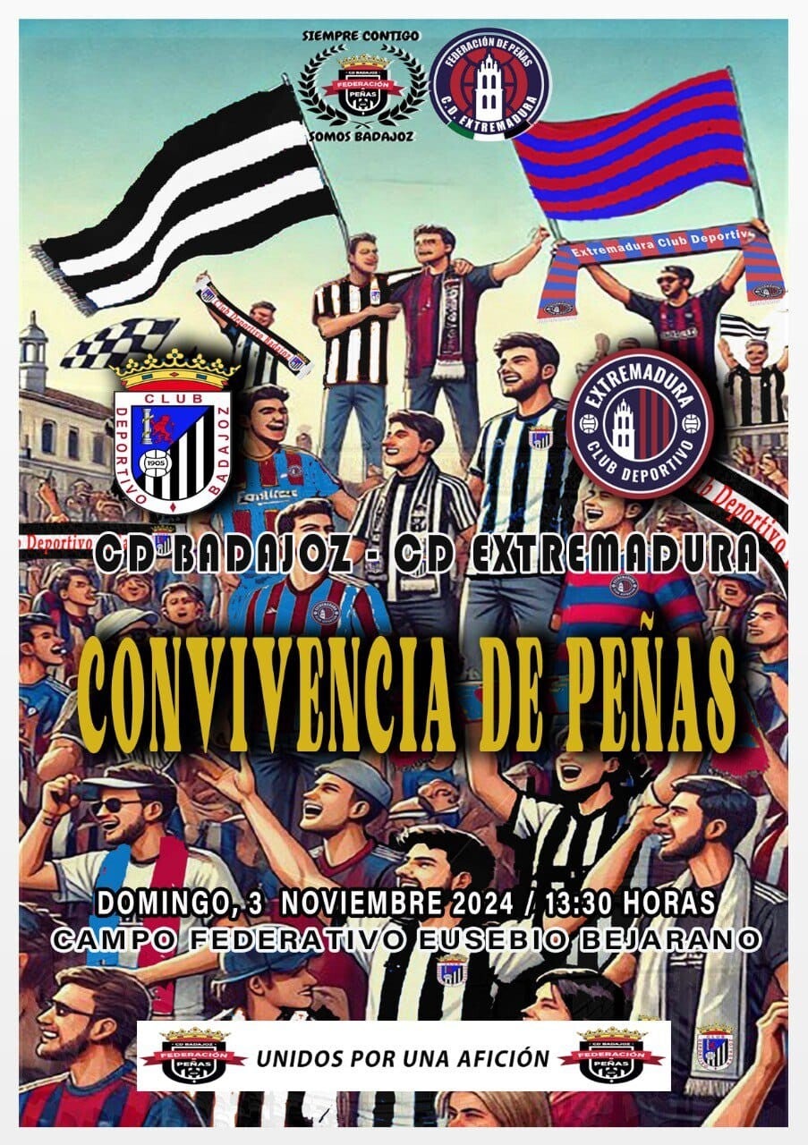 La Federación de Peñas del CD Badajoz organiza una convivencia de peñas del CD Badajoz y del CD Extremadura, que tendrá lugar el próximo domingo día 3 de noviembre a las 13:30 horas en los Campos Federativos Eusebio Bejarano.